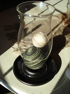 I then filled a hurricane lamp (the glassware section of Goodwill has tons!) with the yarn-wrapped balls and voila.....a centerpiece.