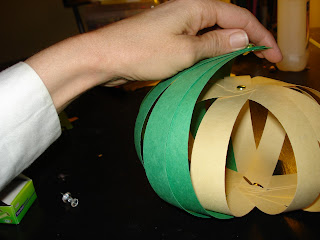 Put a paper fastener through one end of the strips.....your "inner" pumpkin color should be on the bottom of the stack of strips.