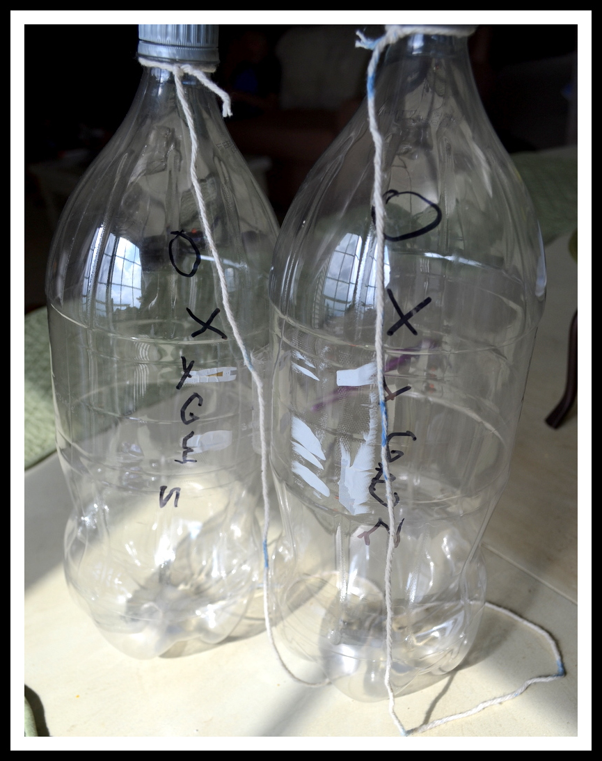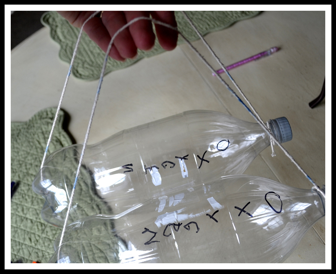 Because it was a large class with not a lot of time, her teacher simplified the project by just taping the string to the top and bottom of the bottles.