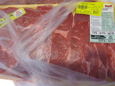 Are you seeing these prices??? $17 worth of sirloin for $6.50! A $13 pork loin roast for $4! I split that in half and got 2 meals out of it (which will each have leftovers!)! So that's $2/meal for a family of 4! And that 92% fat-free ground beef... oh yeah, I got 8 packs of that! I also found boneless, skinless chicken breasts for 79 cents/lb., plus chicken breast w/ bone-in for $1/lb. I seriously cleaned up in the meat aisle. Ask your butcher at your local store what day they mark the meat down. Mine marks it down on Wed. mornings and there are always deals to be found!